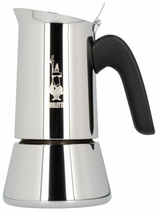 The Bialetti Venus moka pot is a stainless steel Italian style stove top coffee maker. It works on all types of stoves, including induction stoves.