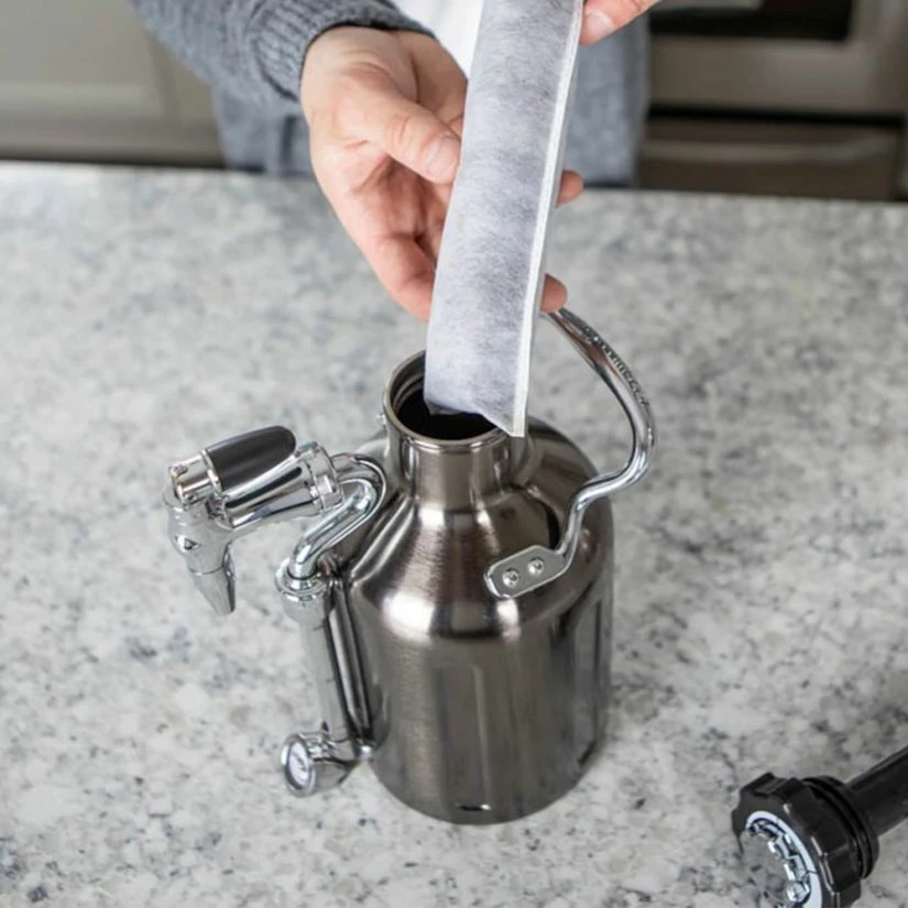 - Contents: uKeg Nitro, serving mat, coffee filter bags (4), 16 g nitro gas chargers (2), coffee funnel, manual and protective shipping bag.