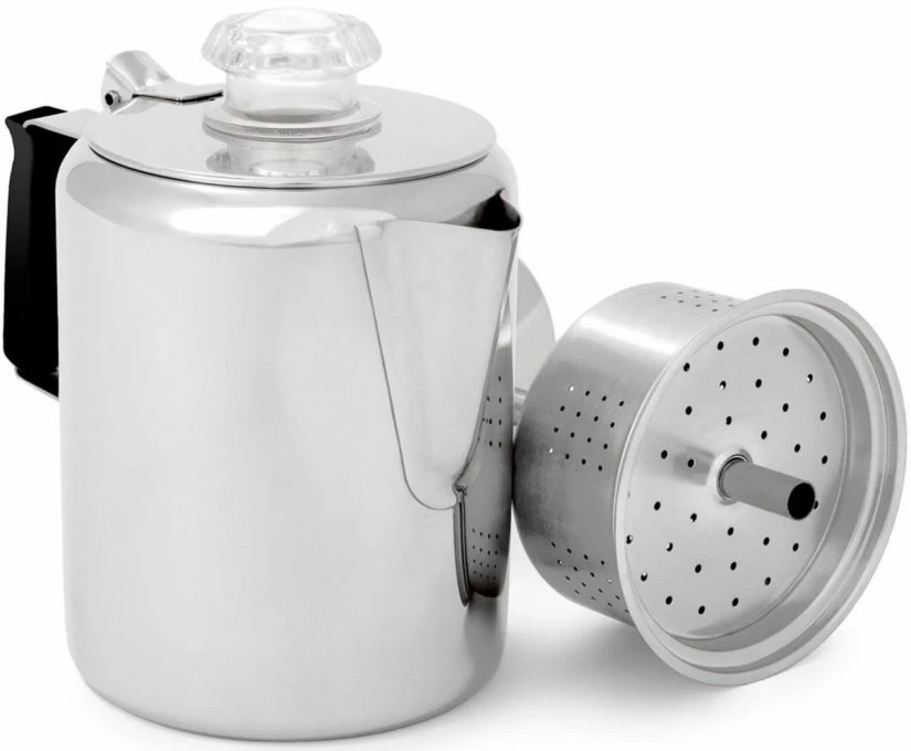Perk up mornings at the campsite or cabin with the classic yet rugged stainless steel Glacier Perc coffee percolator from GSI Outdoors, great coffee maker for use on stove tops.