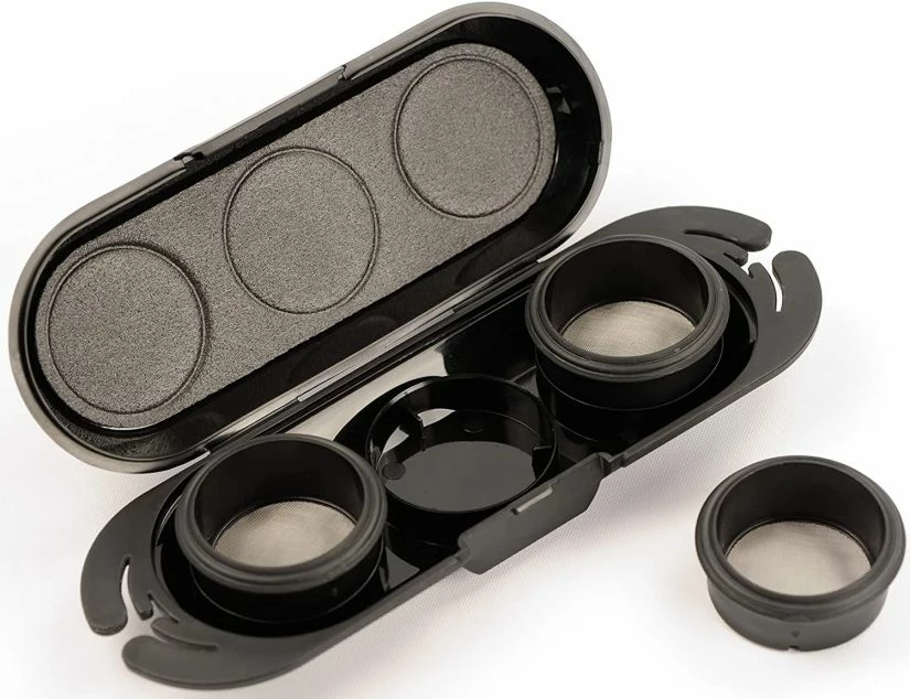 Fill the adapters with the ground coffee of your choice, place them in the case and bring them with you wherever you go. The three domepods are packed safely in the included case, which attaches securely to other Handpresso gear.