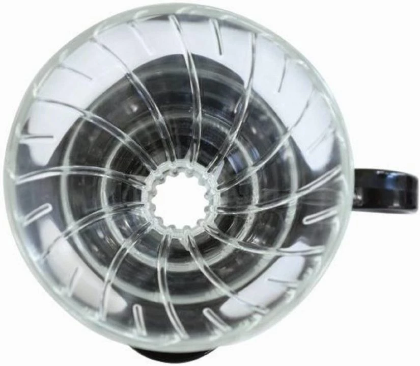 The Hario Glass V60 Coffee Dripper has the same design as all other Hario V60 coffee drippers. It consists of ridges, a large hole in the middle and the V-shape, the only difference is that this dripper is made of glass and has a removable plastic handle.