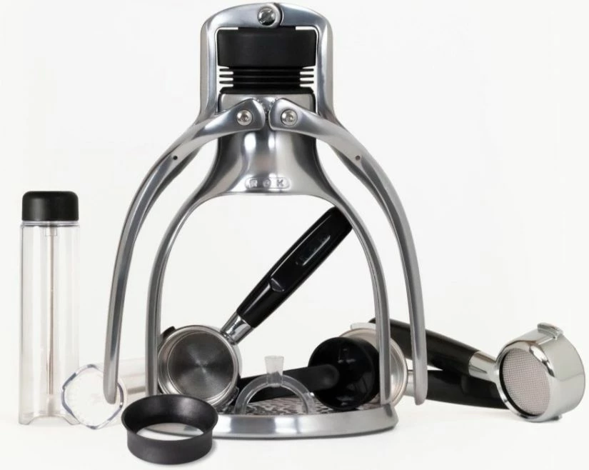 The ROK EspressoGC manual espresso maker is crafted from cast aluminium, steel and glass-composite.